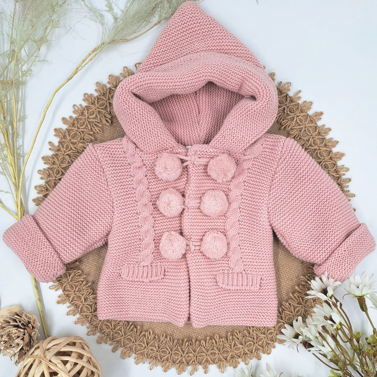 - Abrigo para bebe de punto en un tono maquillaje con capucha y borlas decorativas,