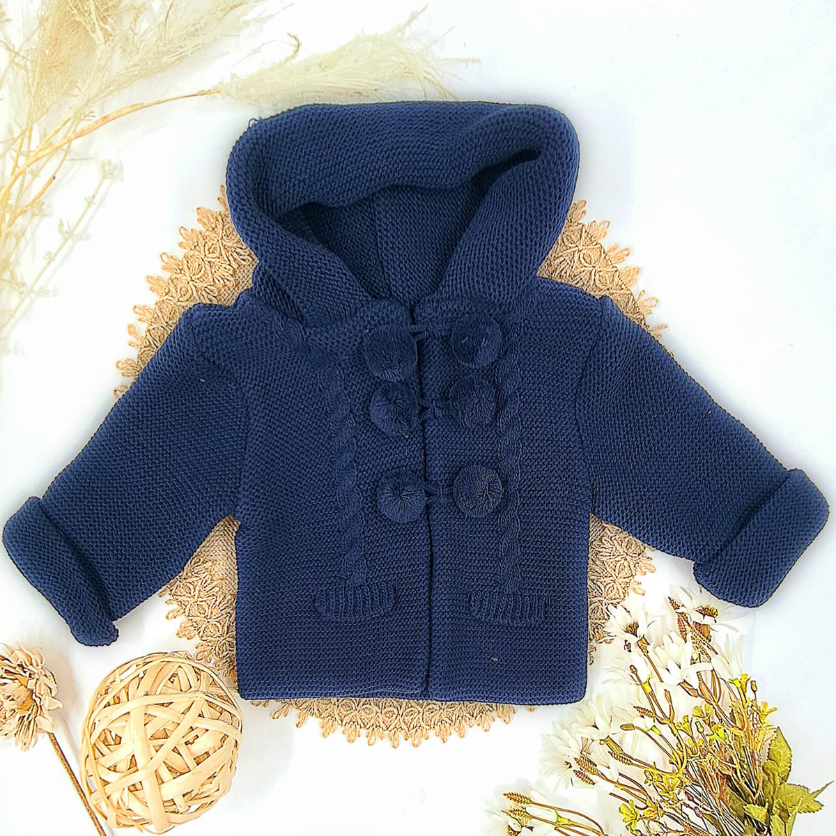 - Abrigo para bebe de punto en un tono marino con capucha y borlas decorativas,