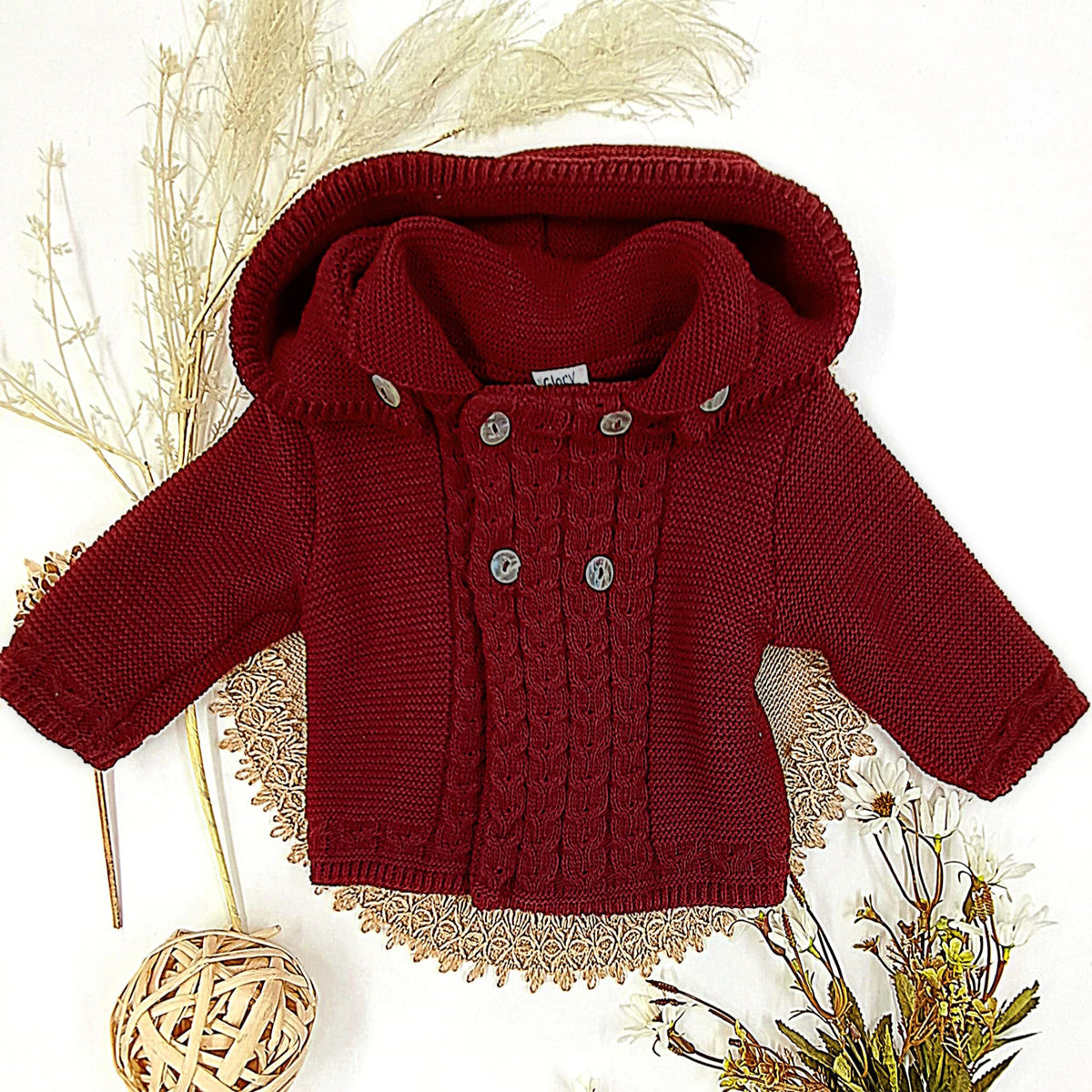 - Abrigo de punto doble en un color granate, capucha desmontable