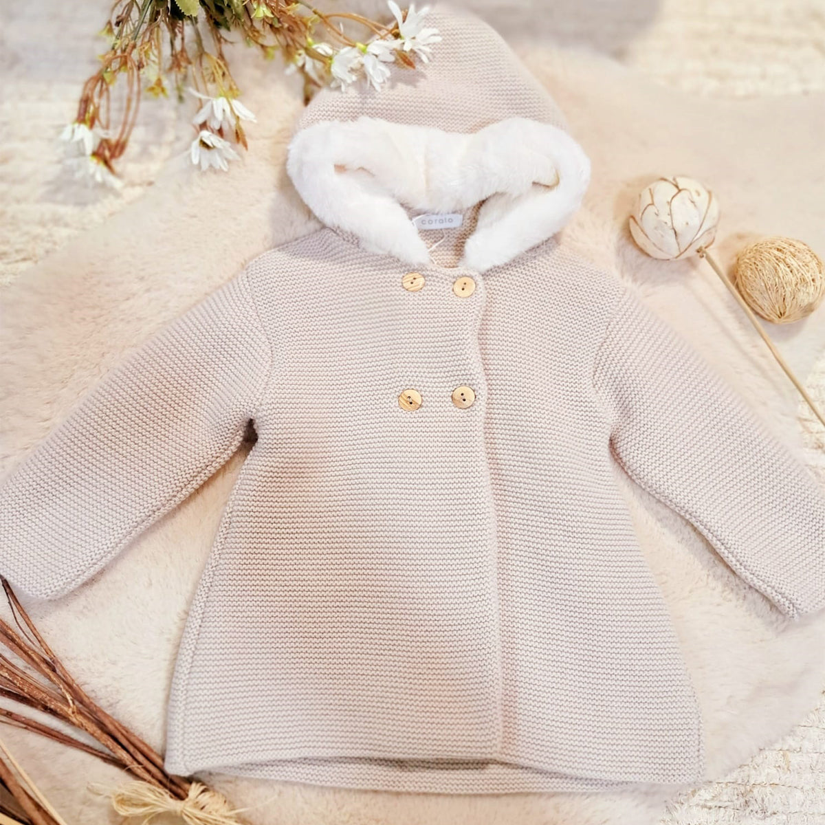 - Abrigo para bebe de punto en un tono piedra con capucha con pelo y botones color madera