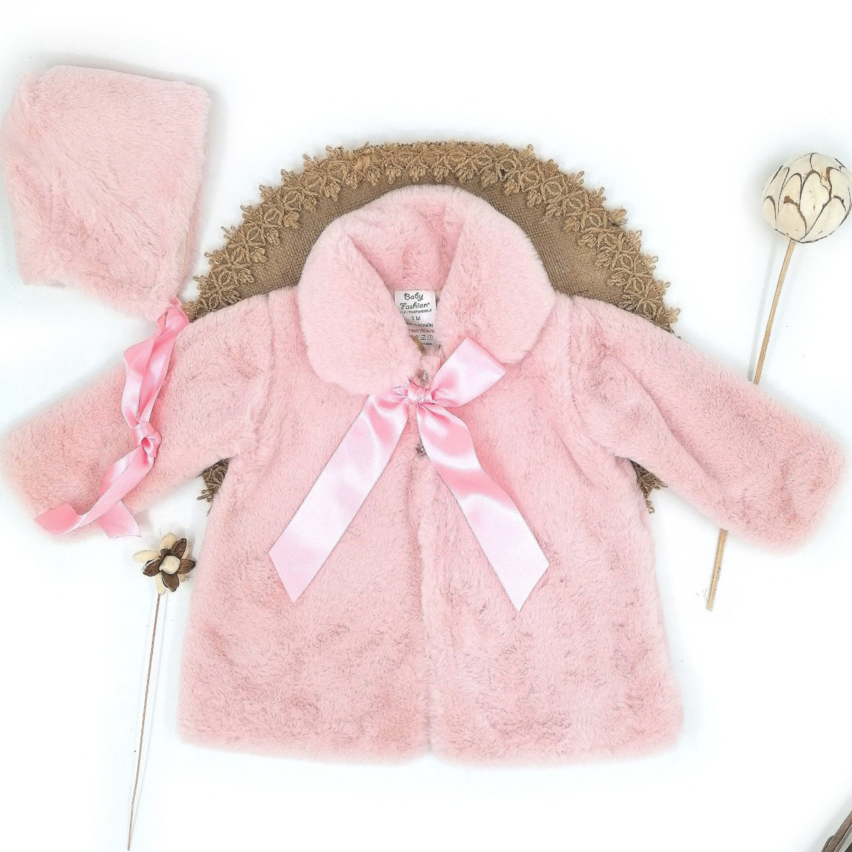 - Abrigo para bebe de pelo en un tono color rosa con capota a juego