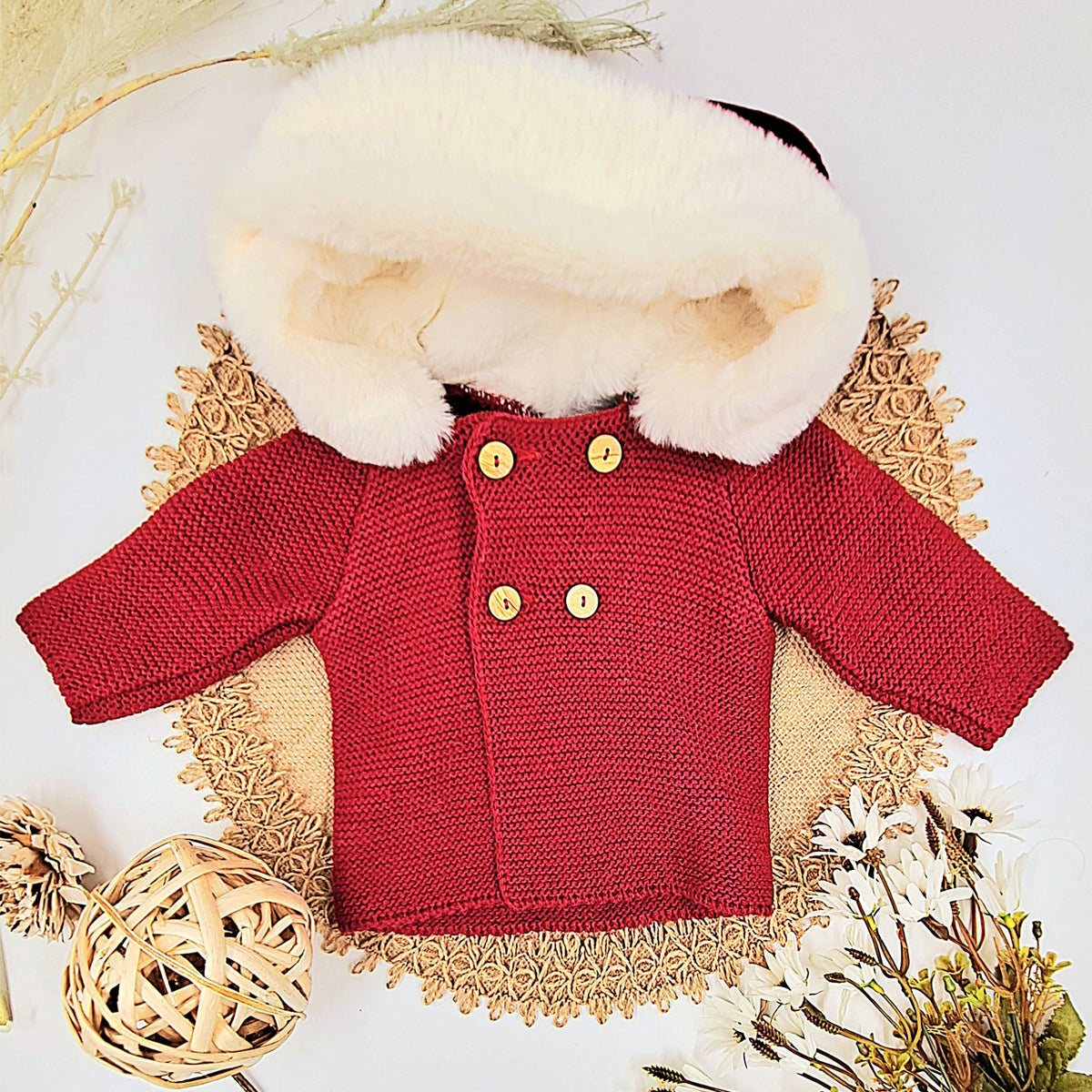 - Abrigo para bebe de punto con capucha en un tono granate, interior de la capucha de pelo color crudo .