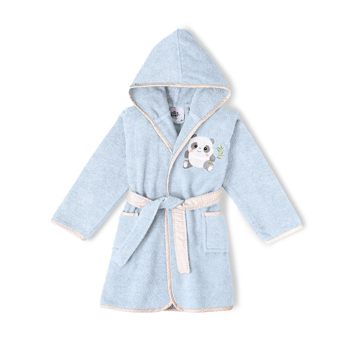 Albornoz de rizo extra suave 100% algodón en un tono celeste. Bordado de un panda.