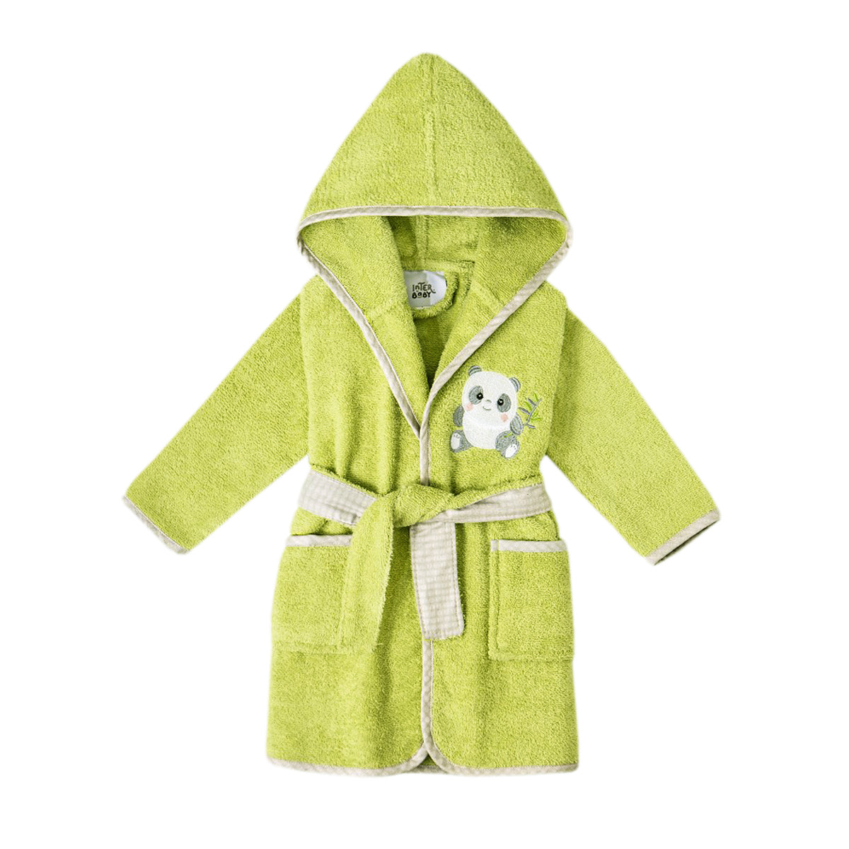 Albornoz de rizo extra suave 100% algodón en un tono pistacho. Bordado de un panda.