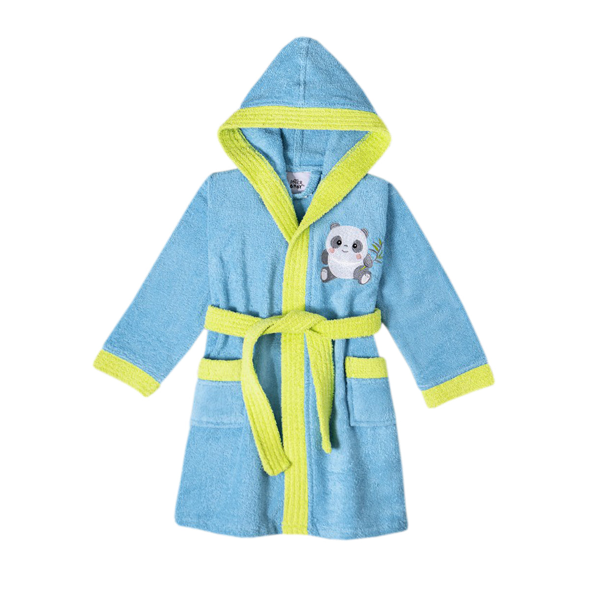 Albornoz de rizo extra suave 100% algodón en un tono turquesa. Bordado de un panda.