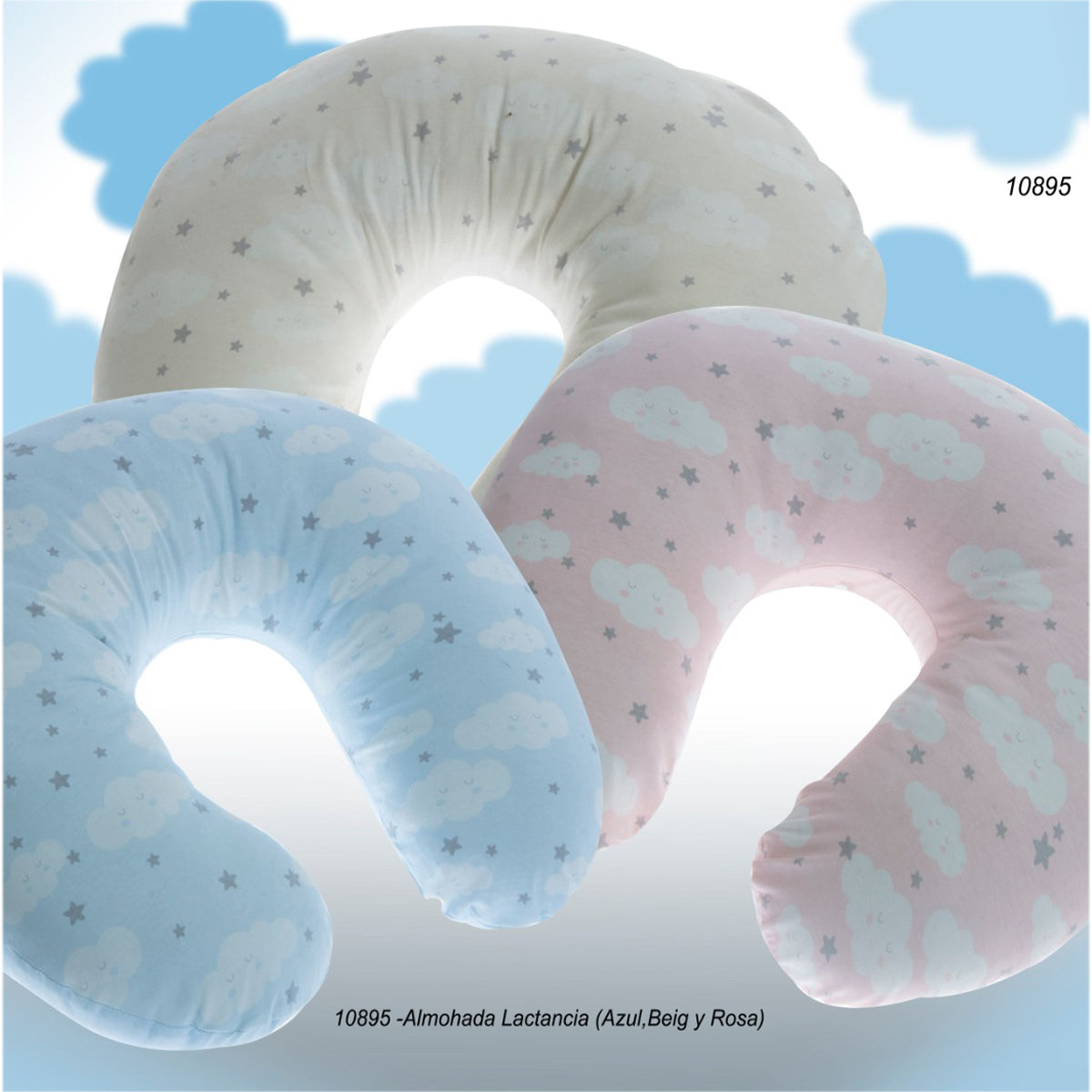 - Cojín de lactancia para bebe, con pequeños dibujos de nubes animadas y estrellas.