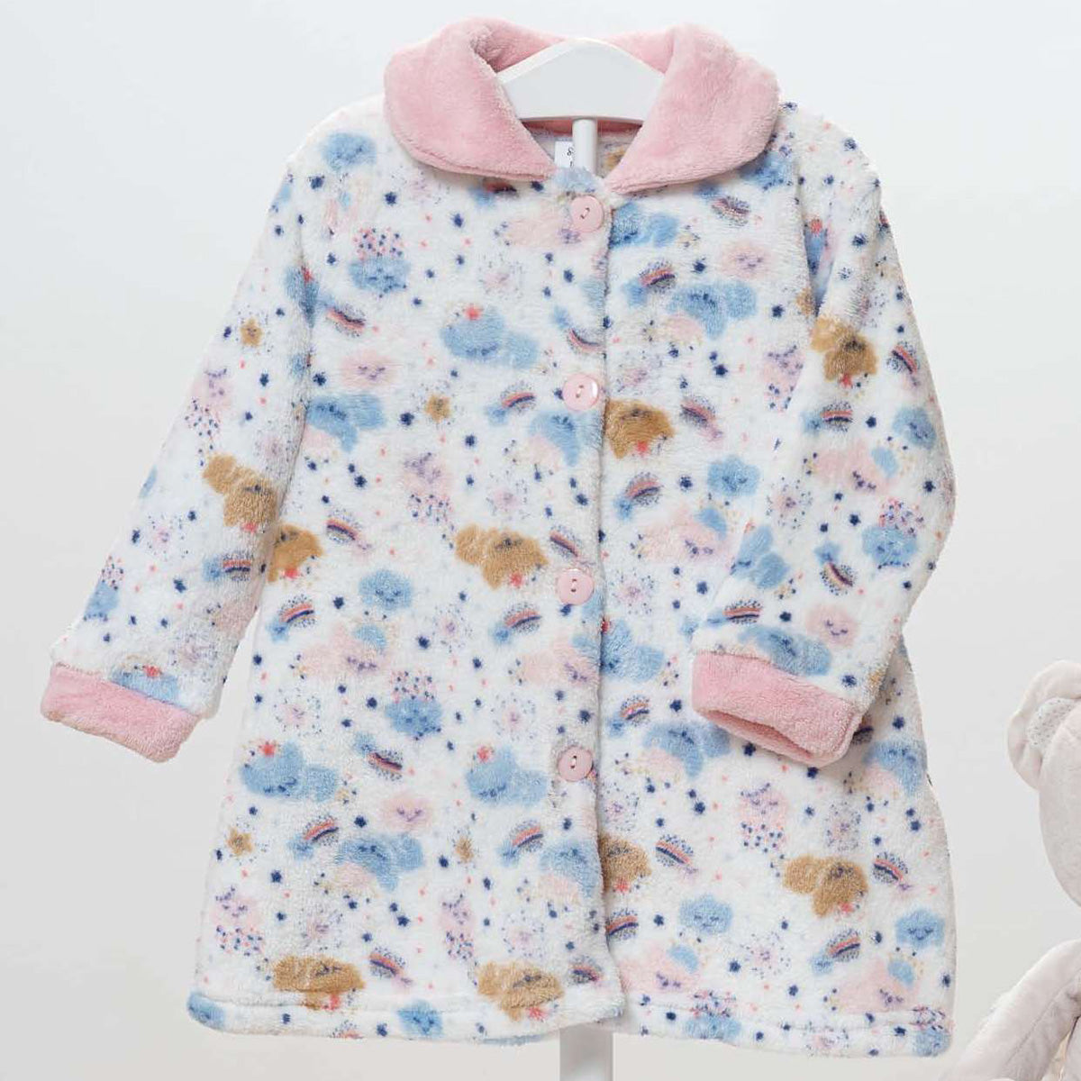 Bata o batín infantil para bebe en tejido tipo coralina, diseño con bordado de luna y oso, este tejido es ideal para los días de invierno ya que proporciona calor al cuerpo.