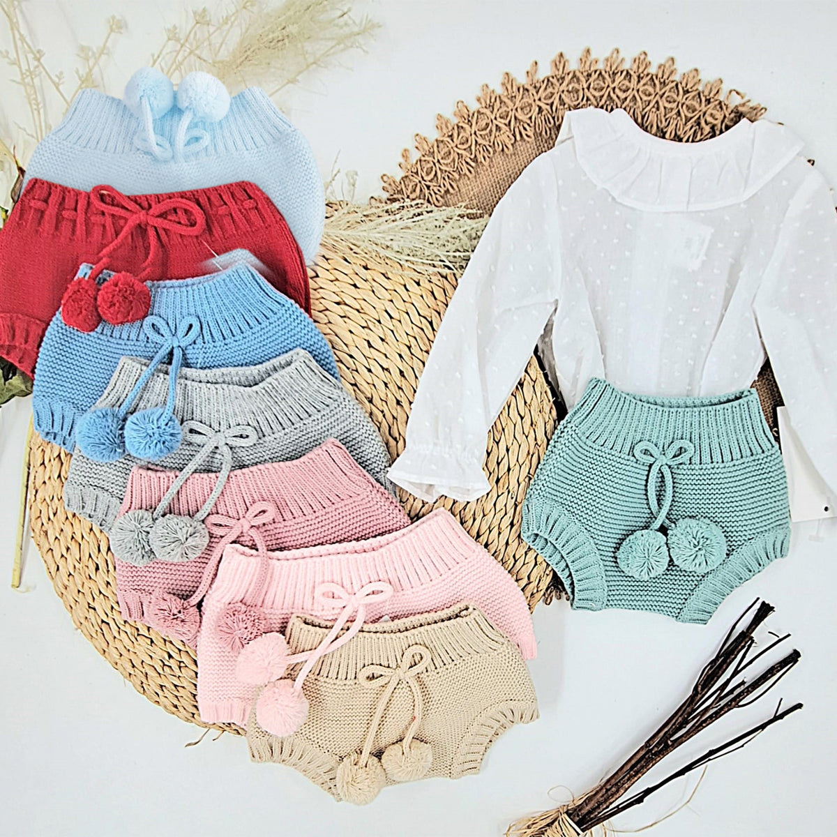 Pololo braga cubrepañal de lana para bebé, diseño con borlas.