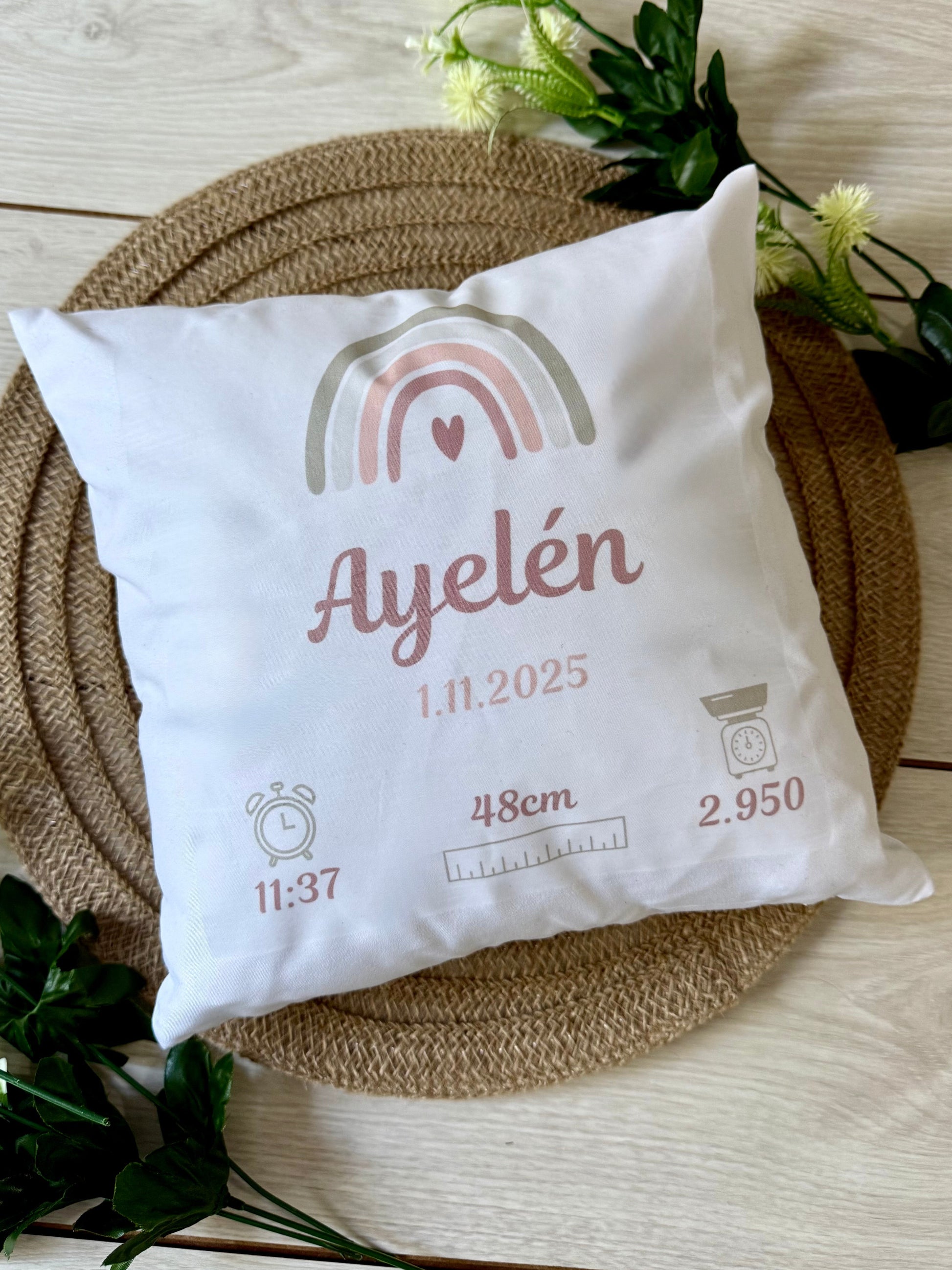 Personalizado con el nombre del bebé, fecha, hora de nacimiento, peso y medida, en un diseño dulce y totalmente a tu gusto.