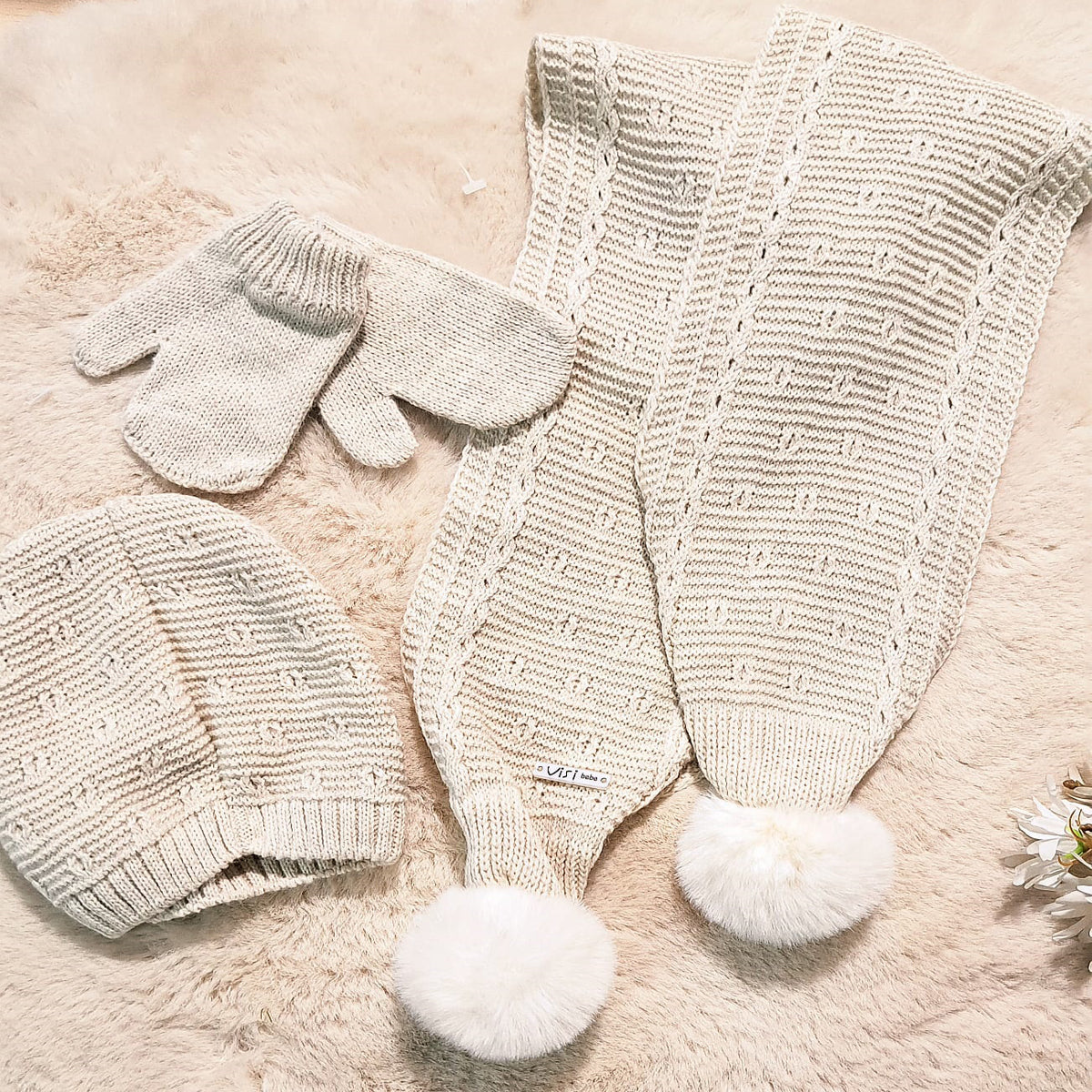 - Conjunto para bebé compuesto por capota, bufanda y manoplas.