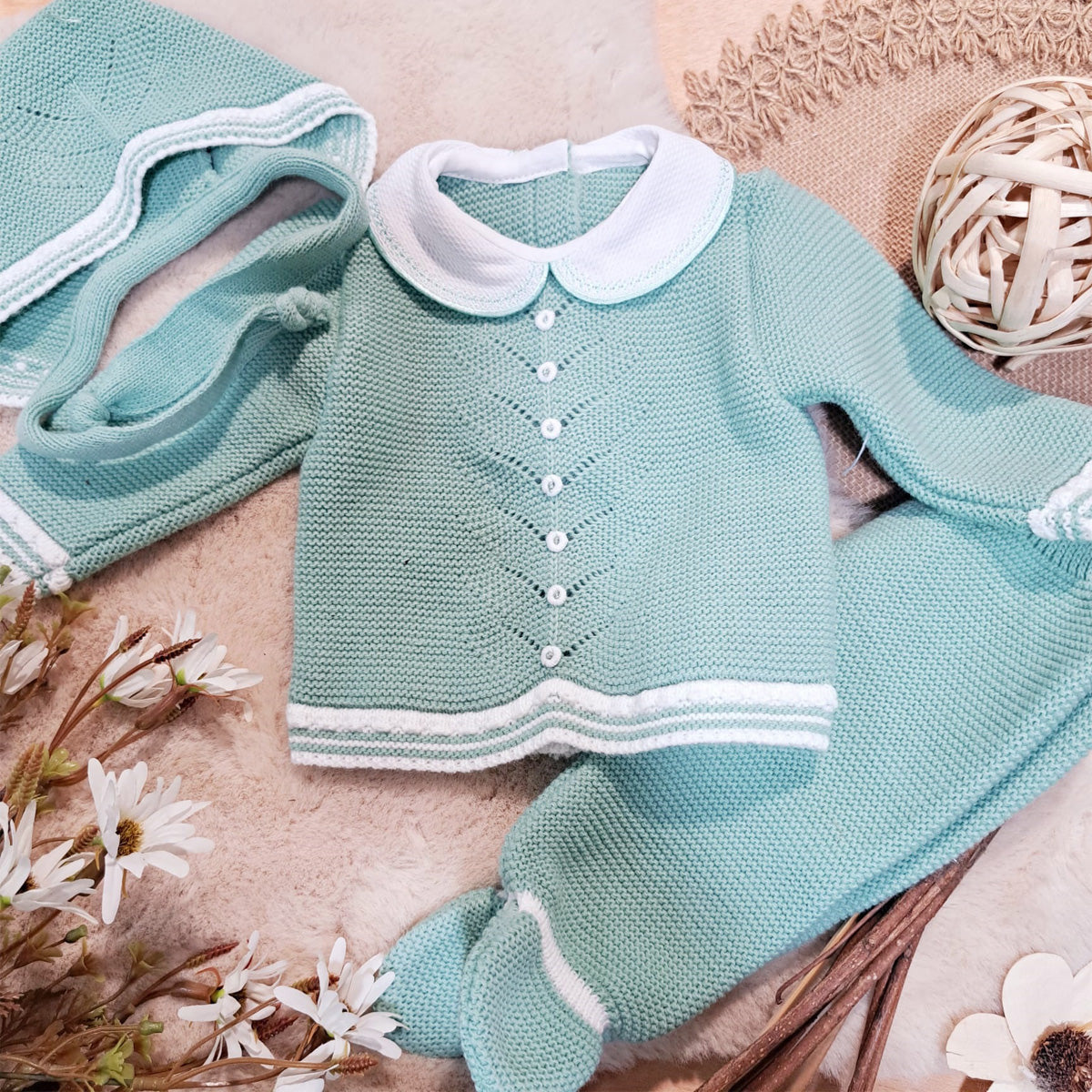 - Conjunto de tres piezas de lana en un tono verde, compuesto de jersey, capota y polaina