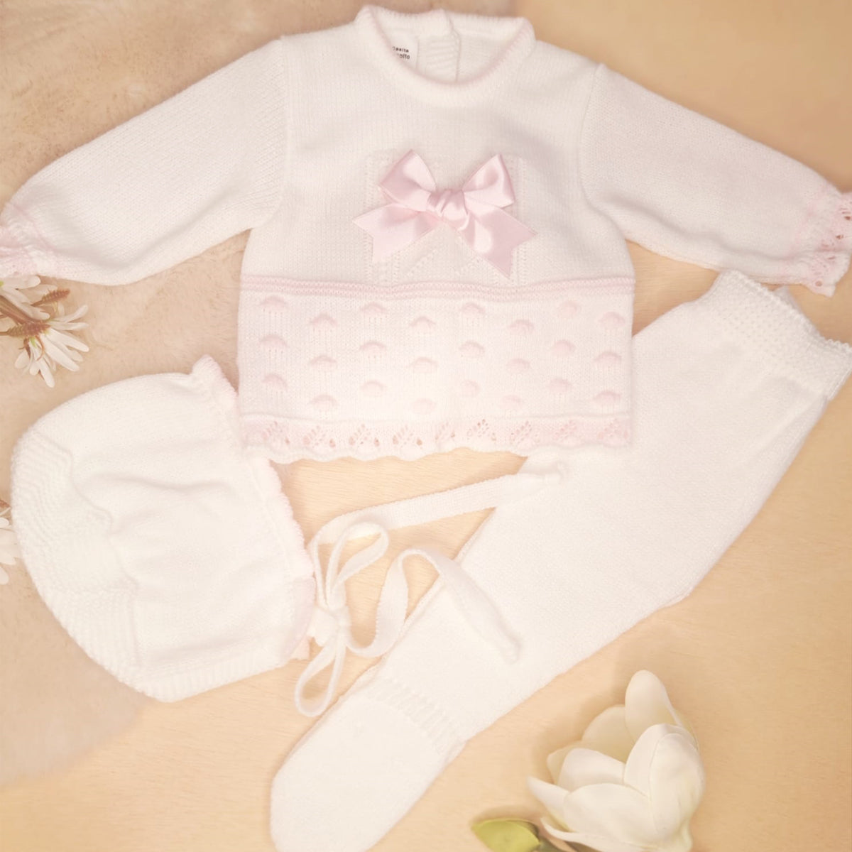 Conjunto de 3 piezas de punto blanco roto/rosa(0 a 3 meses)