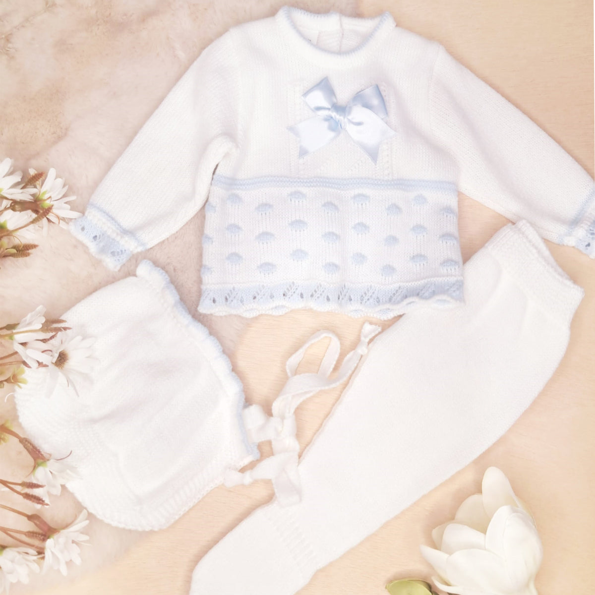 Conjunto de 3 piezas de punto blanco roto/celeste(0 a 3 meses)