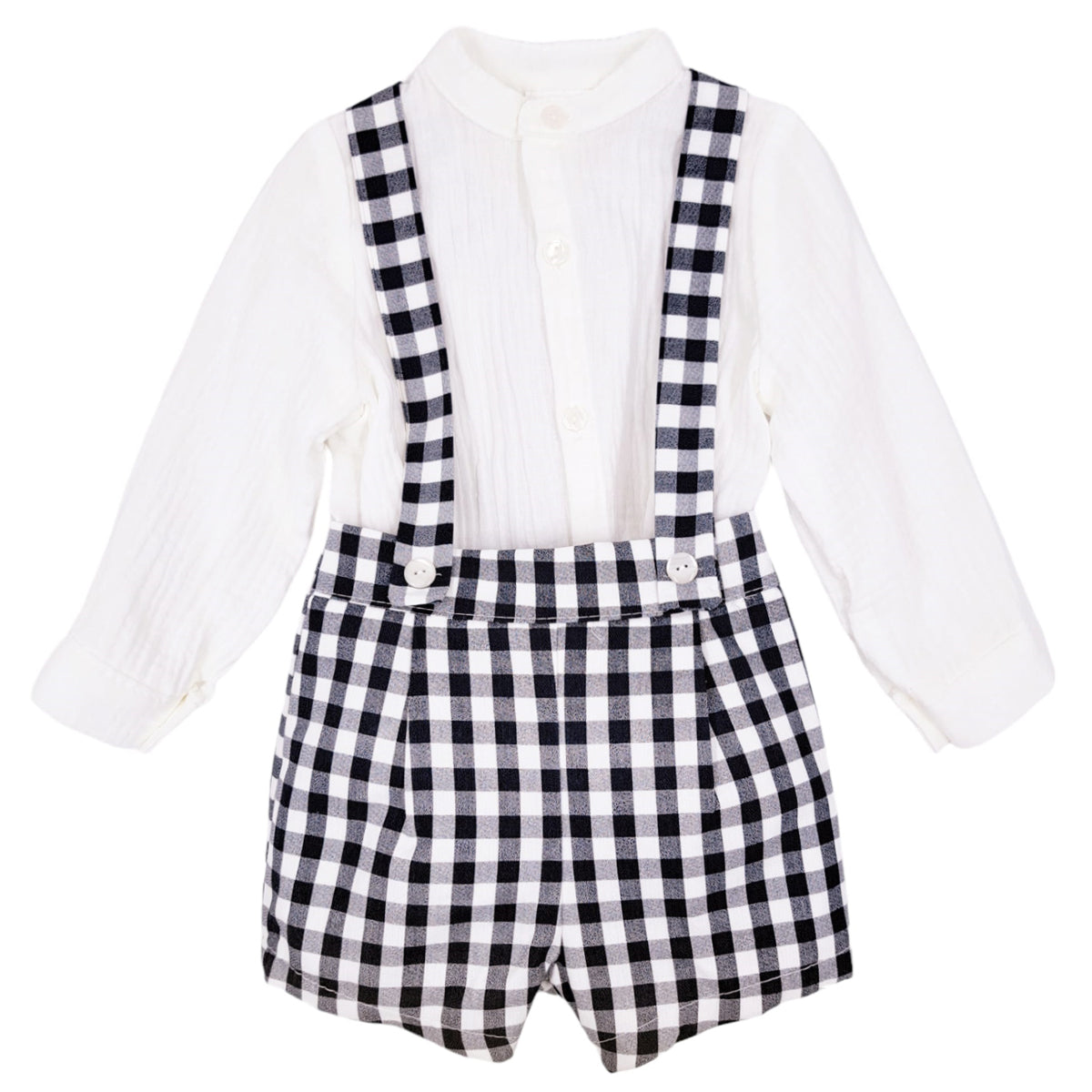- Conjunto de dos piezas tipo pinocho, compuesto de pantalón con tirantes y camisa, diseño camisa en tela tipo bambula con cuello mao y pantalones con tirantes en cuadros.