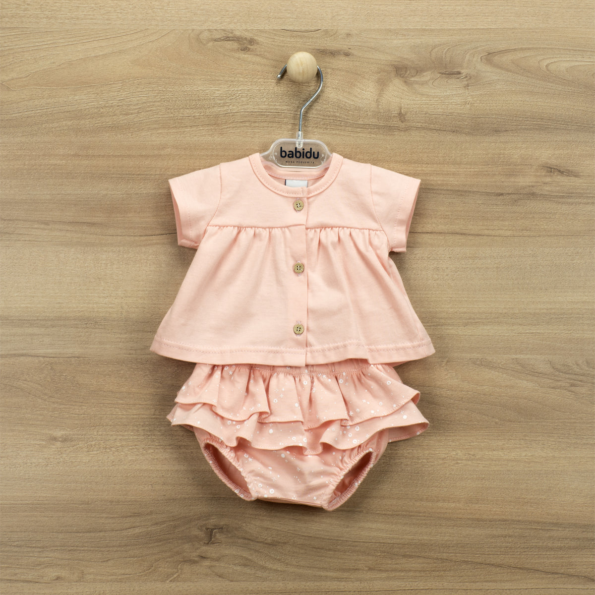Conjunto de dos piezas algodón , embalaje de el producto en percha , diseñado y fabricado en España , marca Babidu.