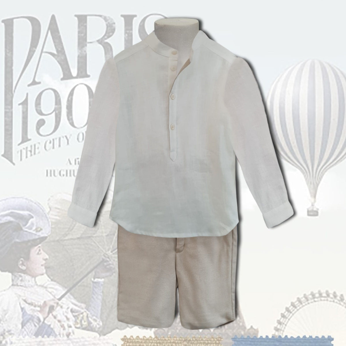 - Diseño: camisa en color crudo manga larga con cuello mao y pantalón bermuda en color nuez