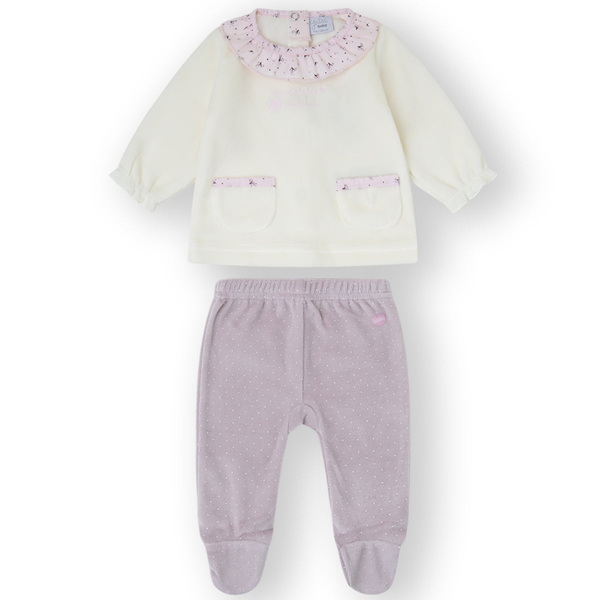 - Conjunto compuesto de dos piezas en tejido tundosado, este tejido es ideal para los días de invierno ya que proporciona calor al cuerpo del bebé además de confort con su agradable tacto suave