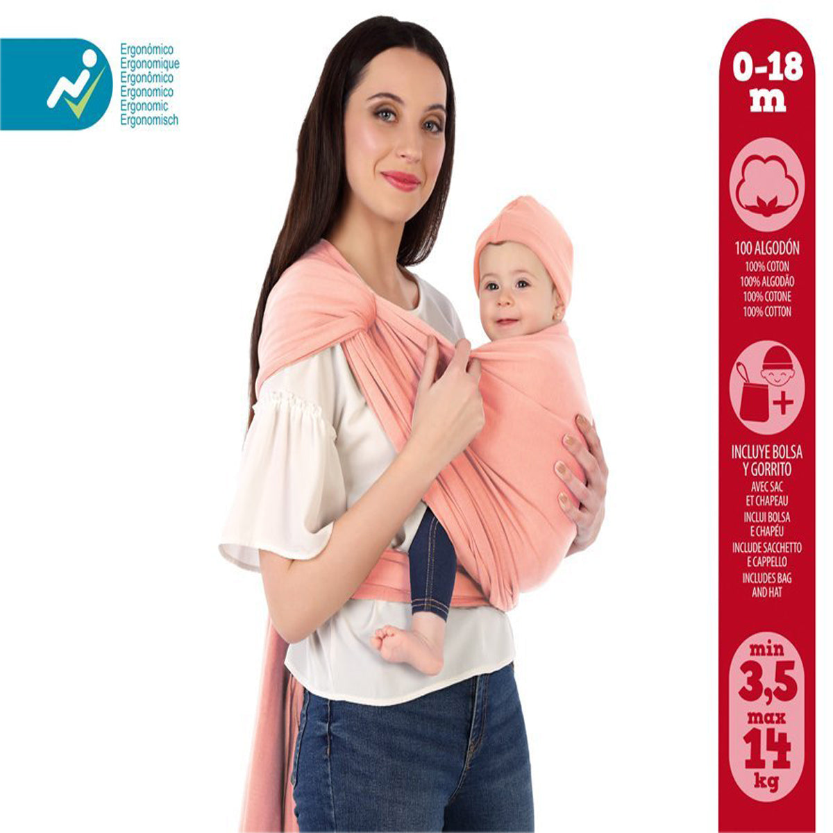 Es elástico, por lo que se ajusta perfectamente al cuerpo del bebé y respeta su posición natural, a la vez que se adapta al cuerpo del adulto repartiendo el peso equitativamente entre los hombros, la cadera y la espalda.