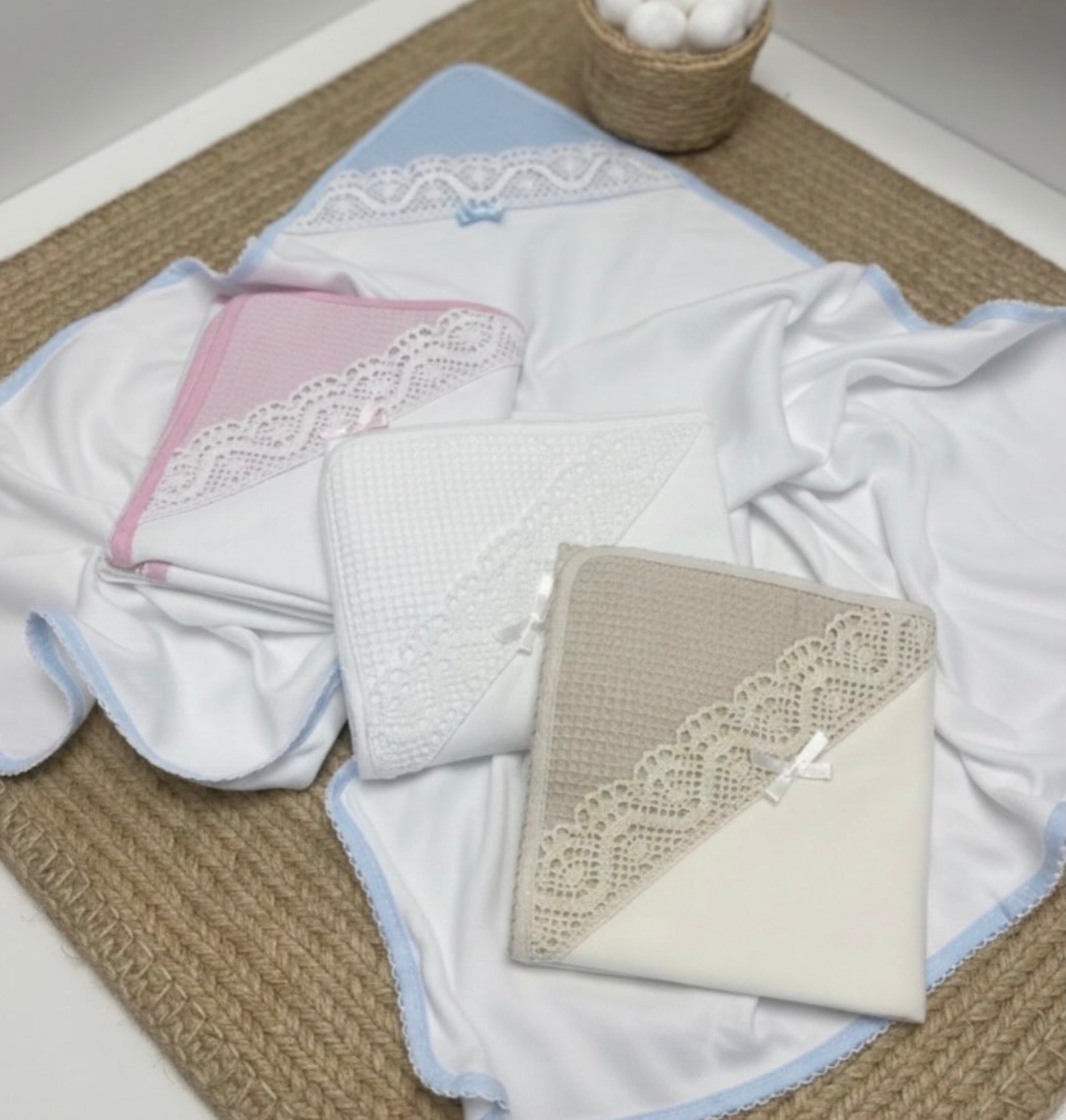 Con un tamaño ideal de 65x65 cm, es una prenda imprescindible en la canastilla del recién nacido por su versatilidad y comodidad. Su diseño incorpora delicados detalles de encaje y acabados cuidados que aportan un toque elegante y especial..