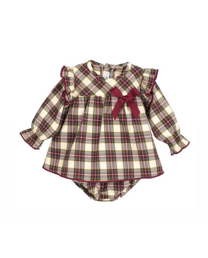 Conjunto de dos piezas que incluye jesusito de manga larga con cuadros tartán, volantes en hombros y puños, y lazo decorativo de grosgrain burdeos. Lleva braguita a juego incluida. Cierre trasero con botones para mayor facilidad.