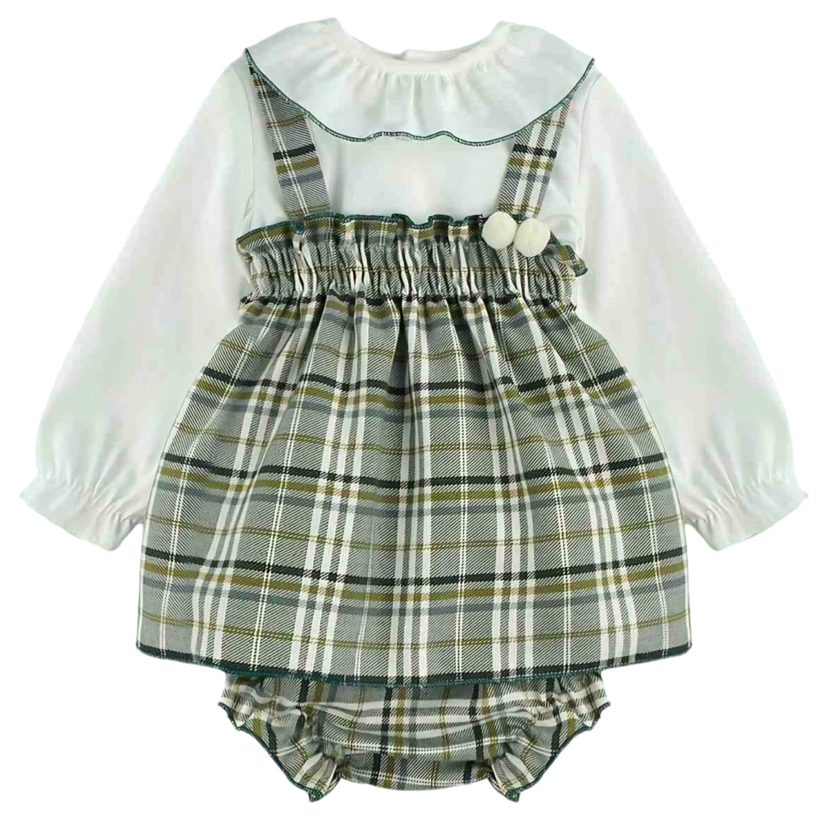 Jesusito de tres piezas tipo pichi para bebe, compuesto por vestido/pichi de tela blusa y cubre pañal a juego, diseño con borlas decorativas cuadros escoces y blusa cuello batista.
