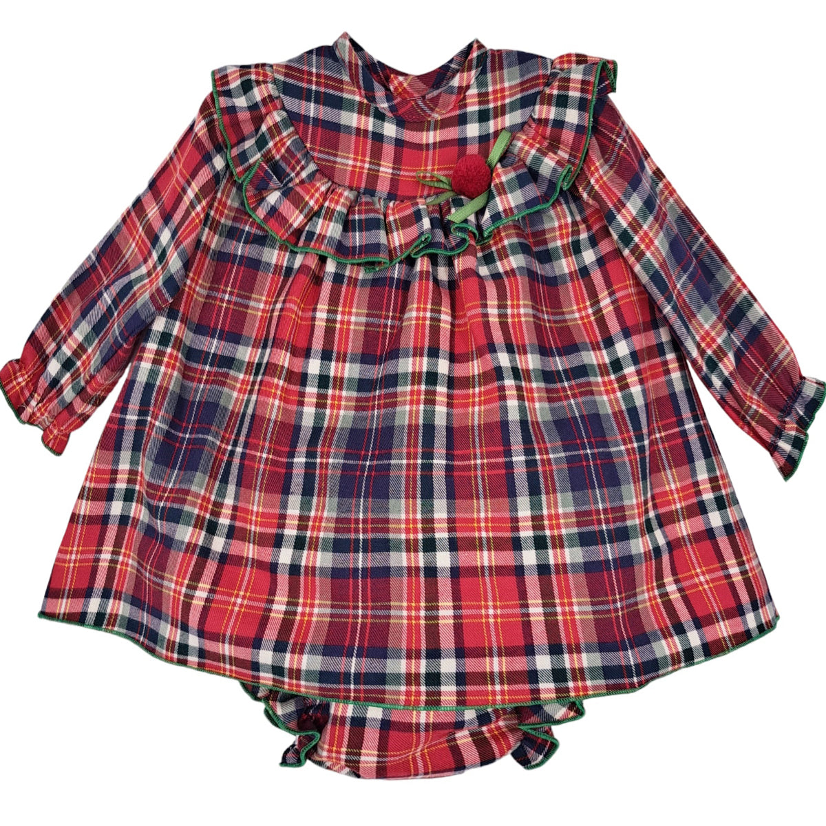 Jesusito de dos piezas para bebe compuesto de vestido con forro interior y cubre pañal a juego, diseño en tela a cuadros tipo escoces y lazo/borla decorativa.