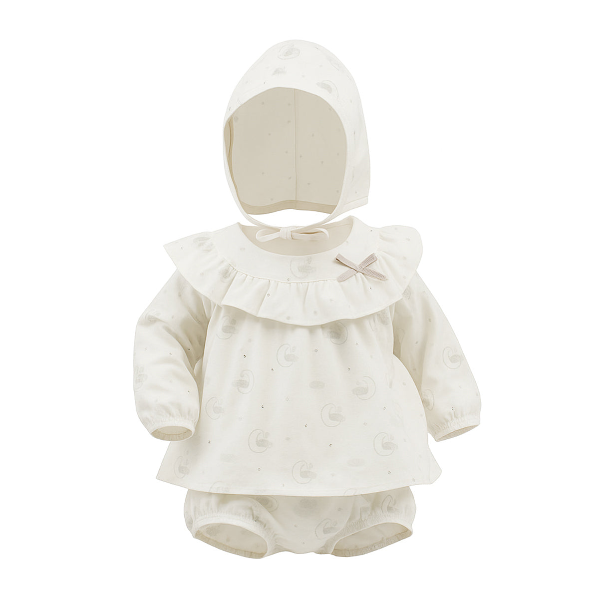 - Jesusito de tres piezas compuesto de vestido, capota y cubre pañal a juego