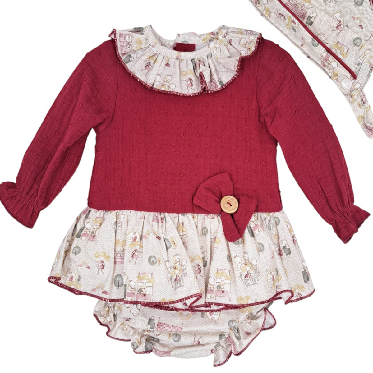 esusito de tres piezas para bebe compuesto de vestido con forro interior capota y cubre pañal a juego, diseño en tela/bambula con dibujos de niña osos y cuello batista.