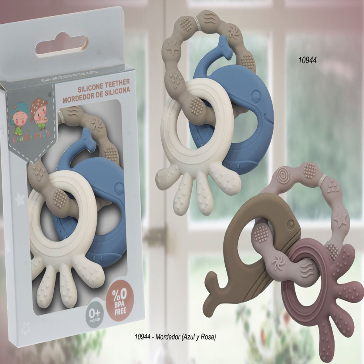 Mordedor de silicona con forma de peces, ideal para aliviar las molestias del bebé.