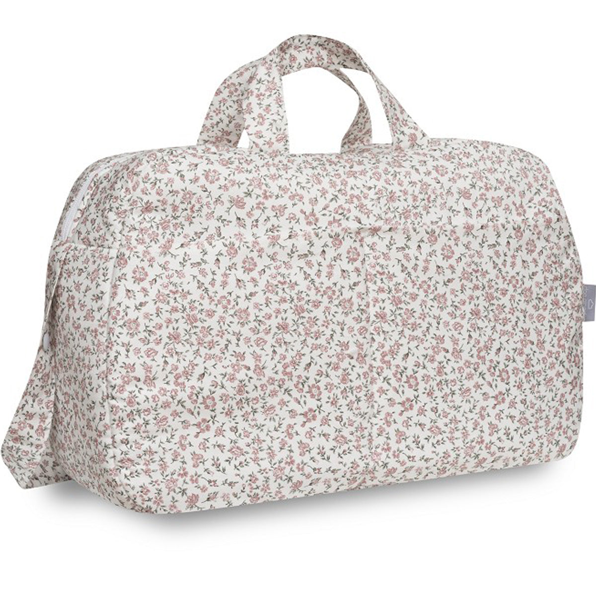 - Bolso maternal en tela floreada color rosa, con asa para colgar del carro, dos bolsillos internos y externos, medidas 46x18x30 aproximadamente