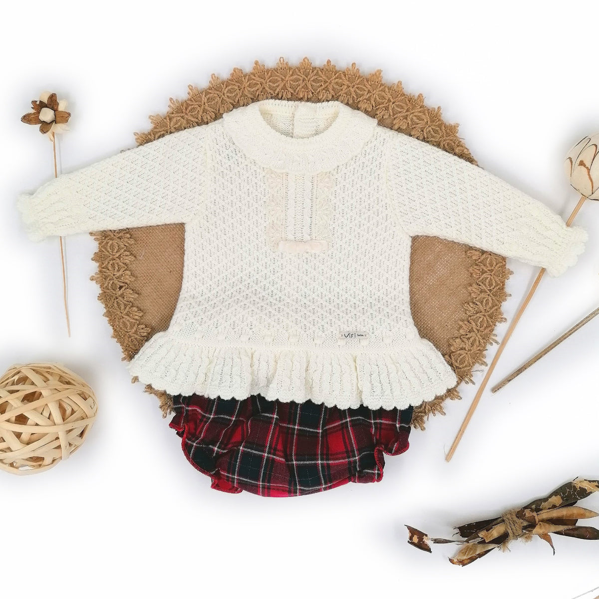 - Diseño : jersey con lazo y tira de puntilla y cubre pañal a cuadros escoces .