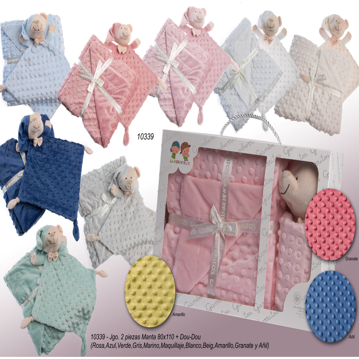 - Set de regalo dos piezas; manta de topitos tacto aterciopelado y doudou a juego en forma de osito (sin personalizar)