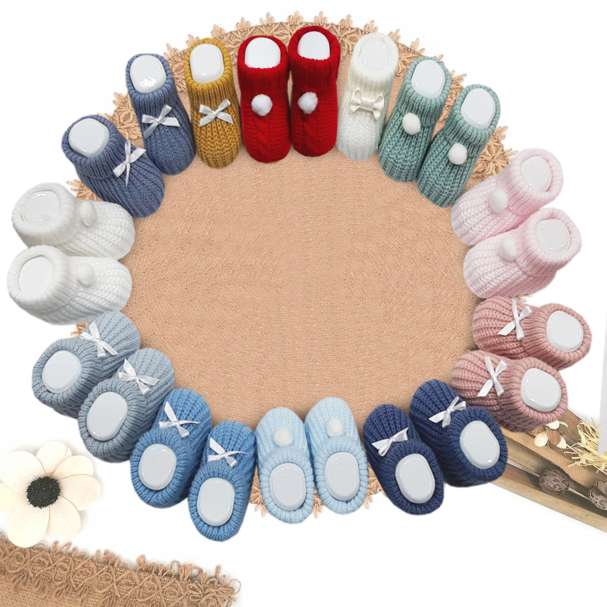 Patuco clásicos de lana para recién nacidos en borla o lazo. Embalaje de el producto en caja expositora. Se vende por unidades.