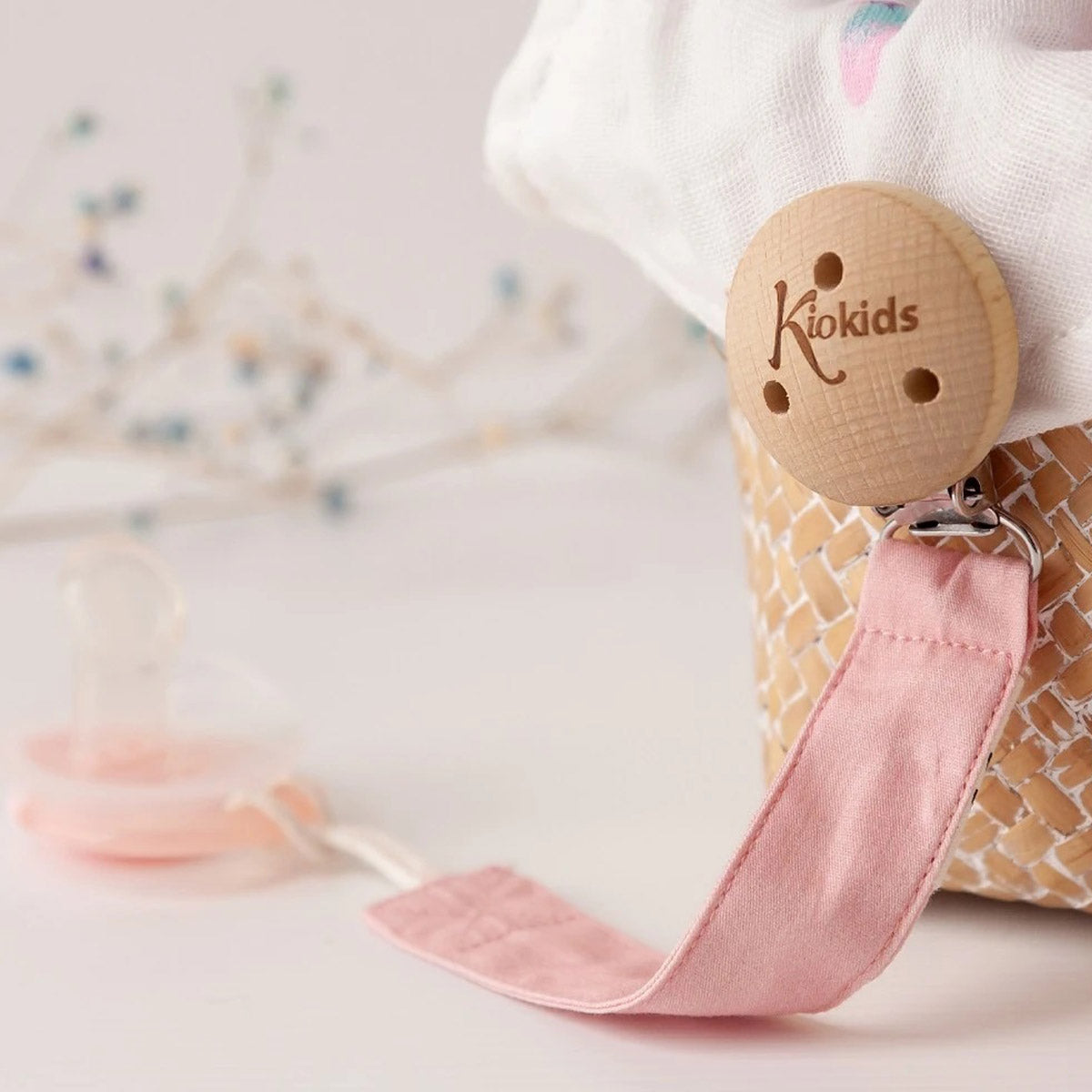 Sujeta chupetes, para acompañar nuestros chupetes. Se sujetan a la cuerda con una pinza en acero inoxidable y madera de haya , y al chupete con una cinta en algodón con un cordel, por lo que se adaptan a cualquier chupete con anilla.