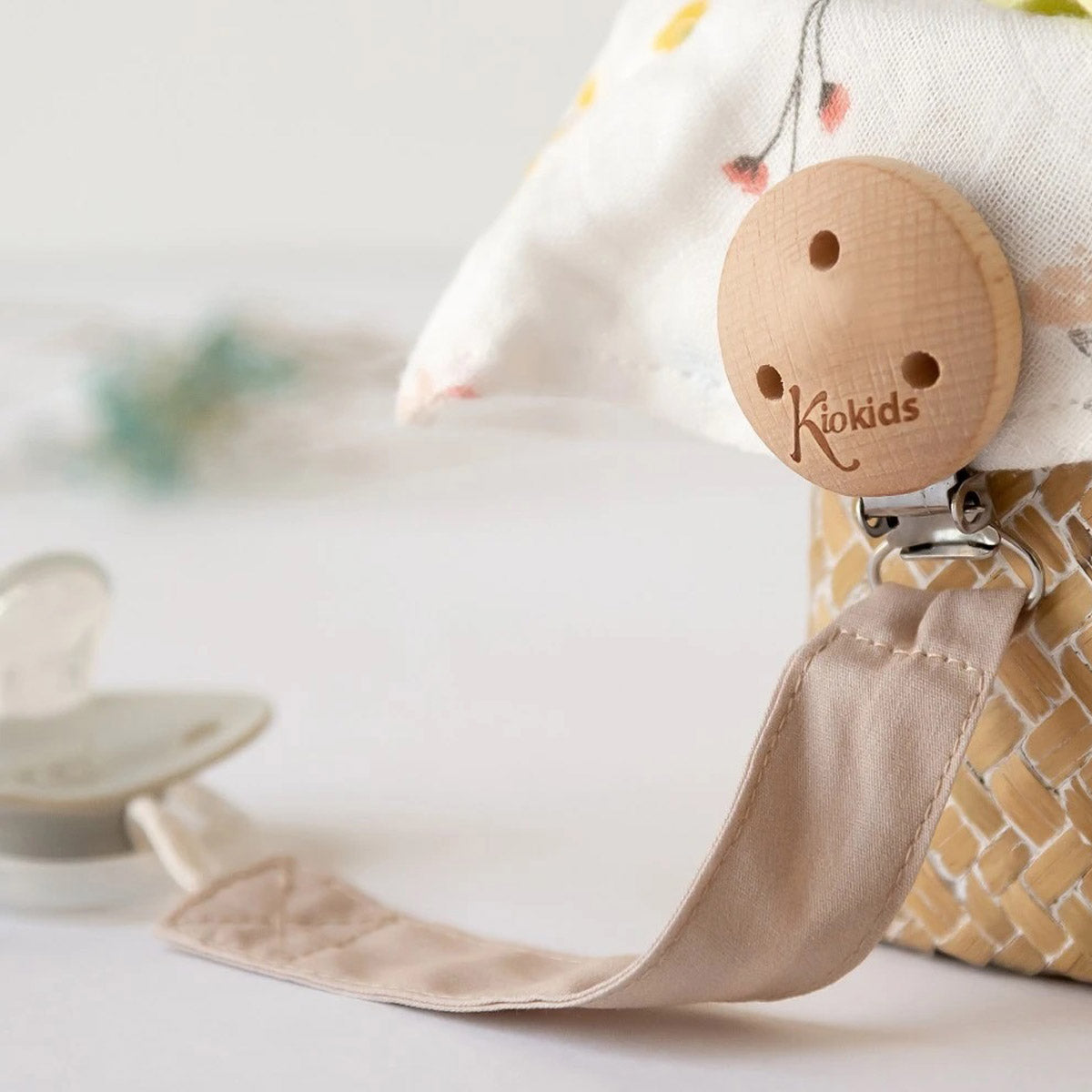 Sujeta chupetes, para acompañar nuestros chupetes. Se sujetan a la cuerda con una pinza en acero inoxidable y madera de haya , y al chupete con una cinta en algodón con un cordel, por lo que se adaptan a cualquier chupete con anilla.