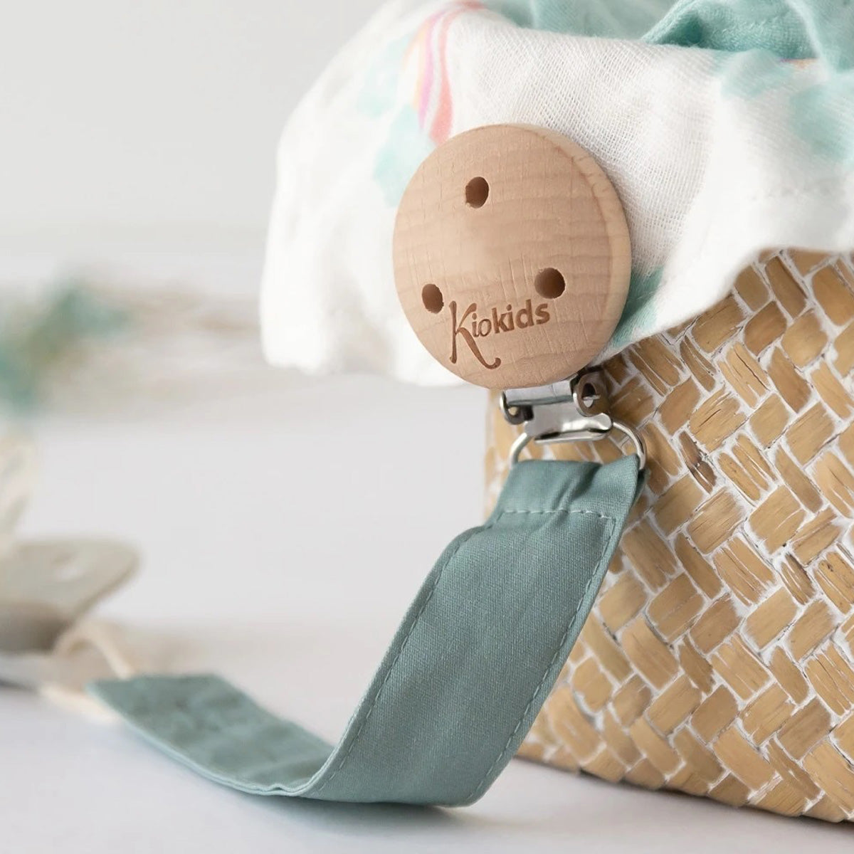 Sujeta chupetes, para acompañar nuestros chupetes. Se sujetan a la cuerda con una pinza en acero inoxidable y madera de haya , y al chupete con una cinta en algodón con un cordel, por lo que se adaptan a cualquier chupete con anilla.