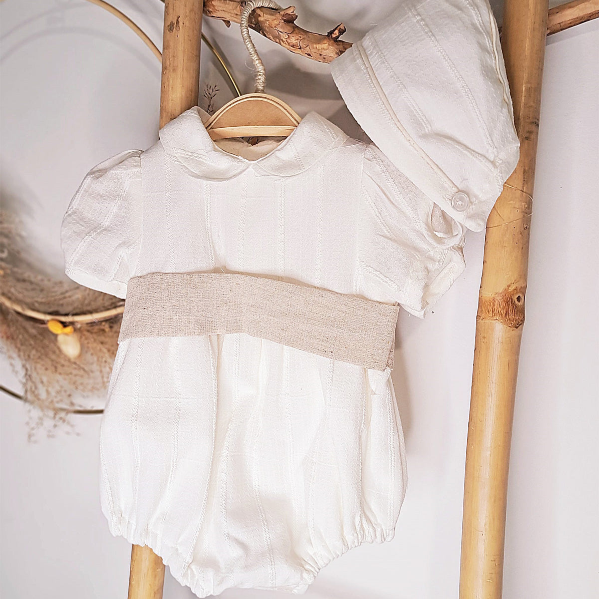 - Ranita de tela para bebe en tono beige con fajín tono arena ideal para ceremonias, con capota a juego.