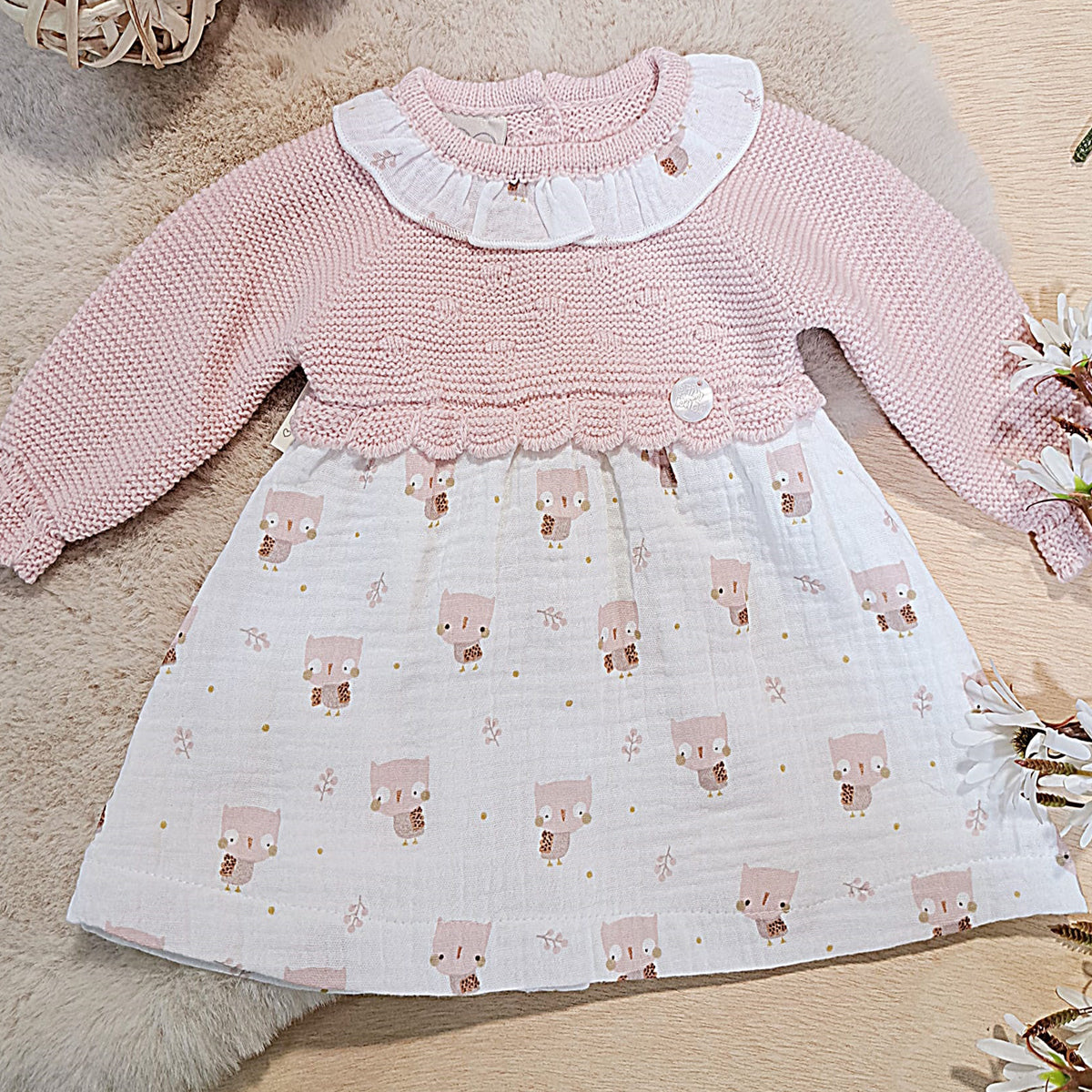 - Vestido de punto/tela para bebes, diseño vestido zona de punto en tono rosa y tela tipo bambula con dibujos de búhos