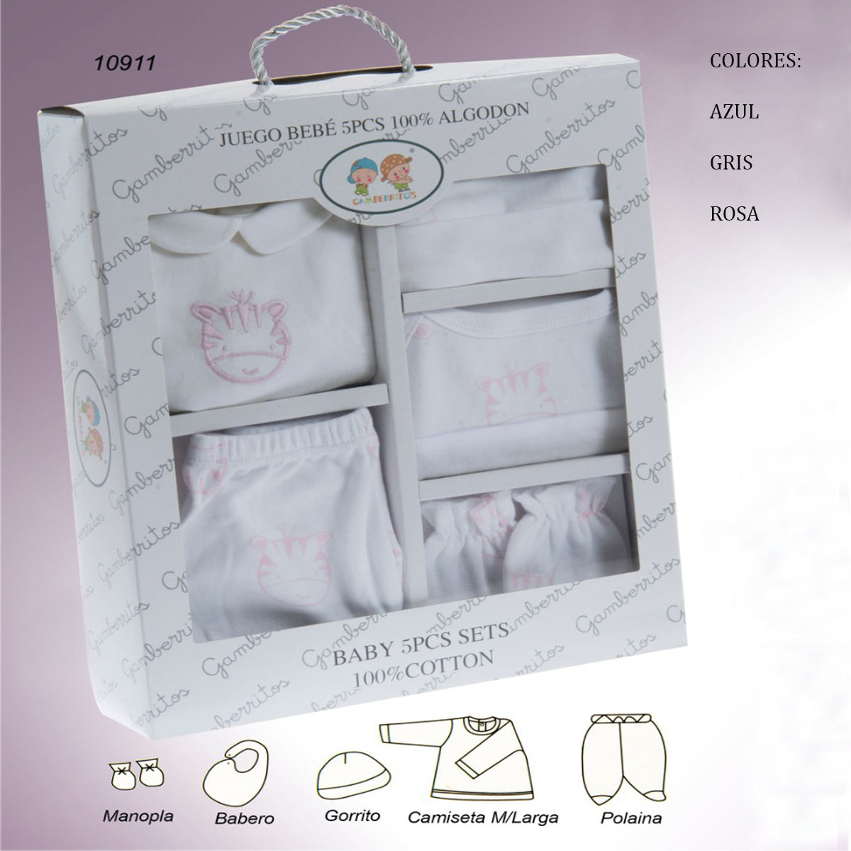 - Embalado en caja con excelente presentación para regalos, contiene; camiseta, polaina, babero, gorro y manoplas, 100% Algodón.
