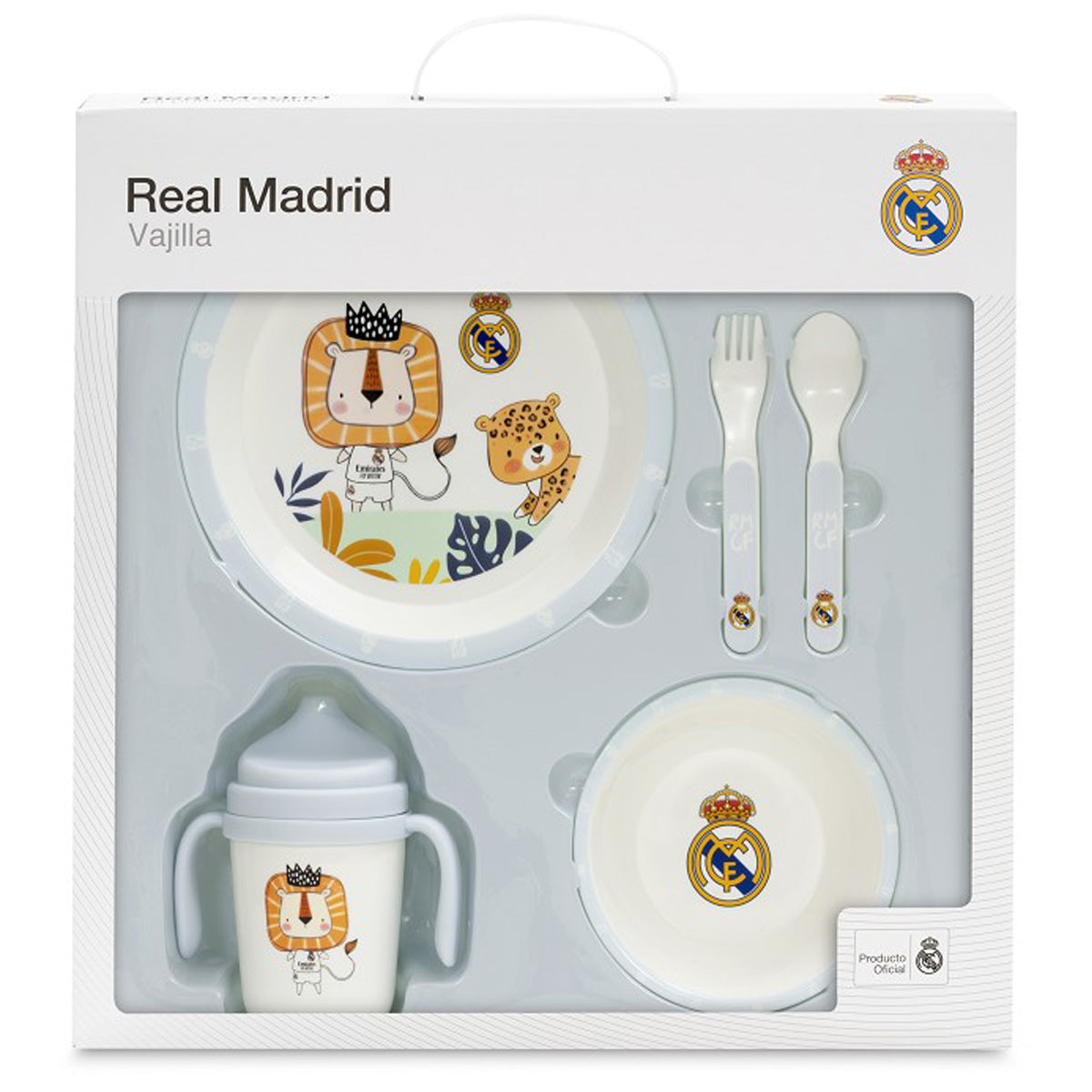 - Set vajilla azul del real Madrid, compuesto de cinco piezas: dos platos, vaso de aprendizaje anti goteo, cuchara y tenedor