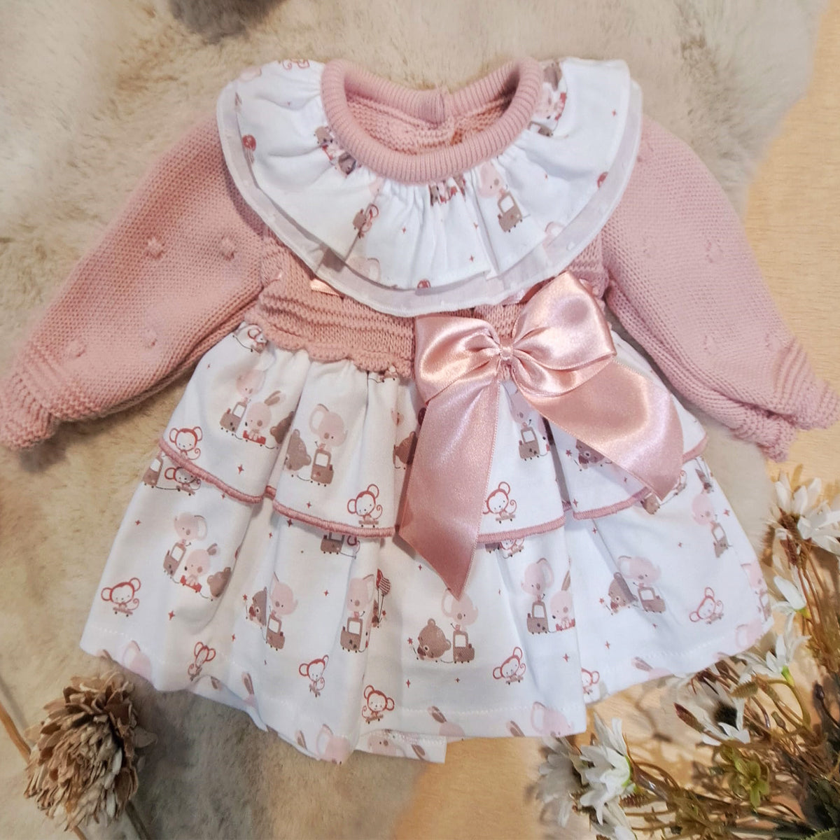 - Vestido para bebe, diseño zona superior de punto con lazo decorativo y cuello bebe, zona inferior de tela estampada con divertidos dibujos de animales de la montaña.
