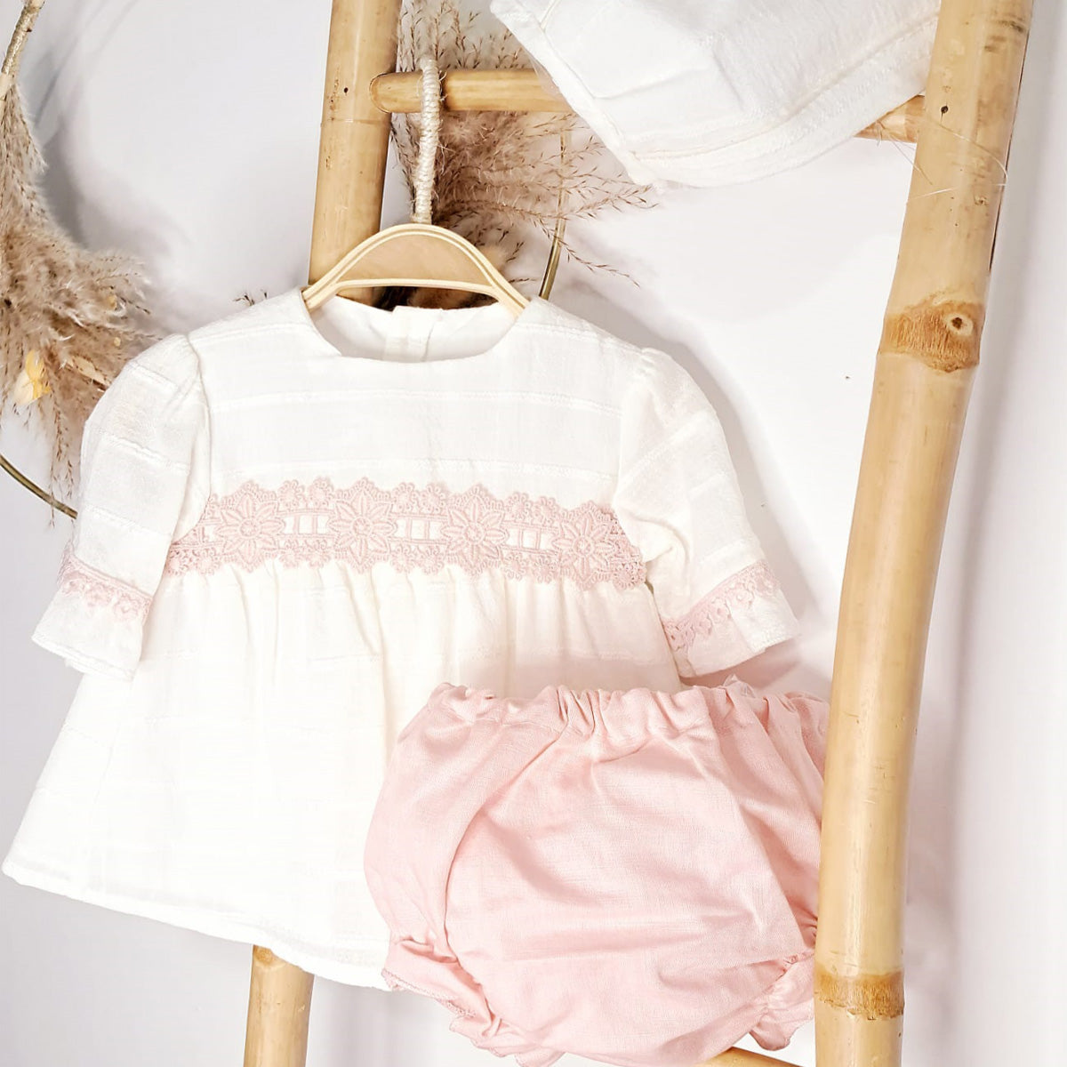 - Jesusito compuesto de vestido, capota y cubre pañal a juego, en un tono crudo/rosa.